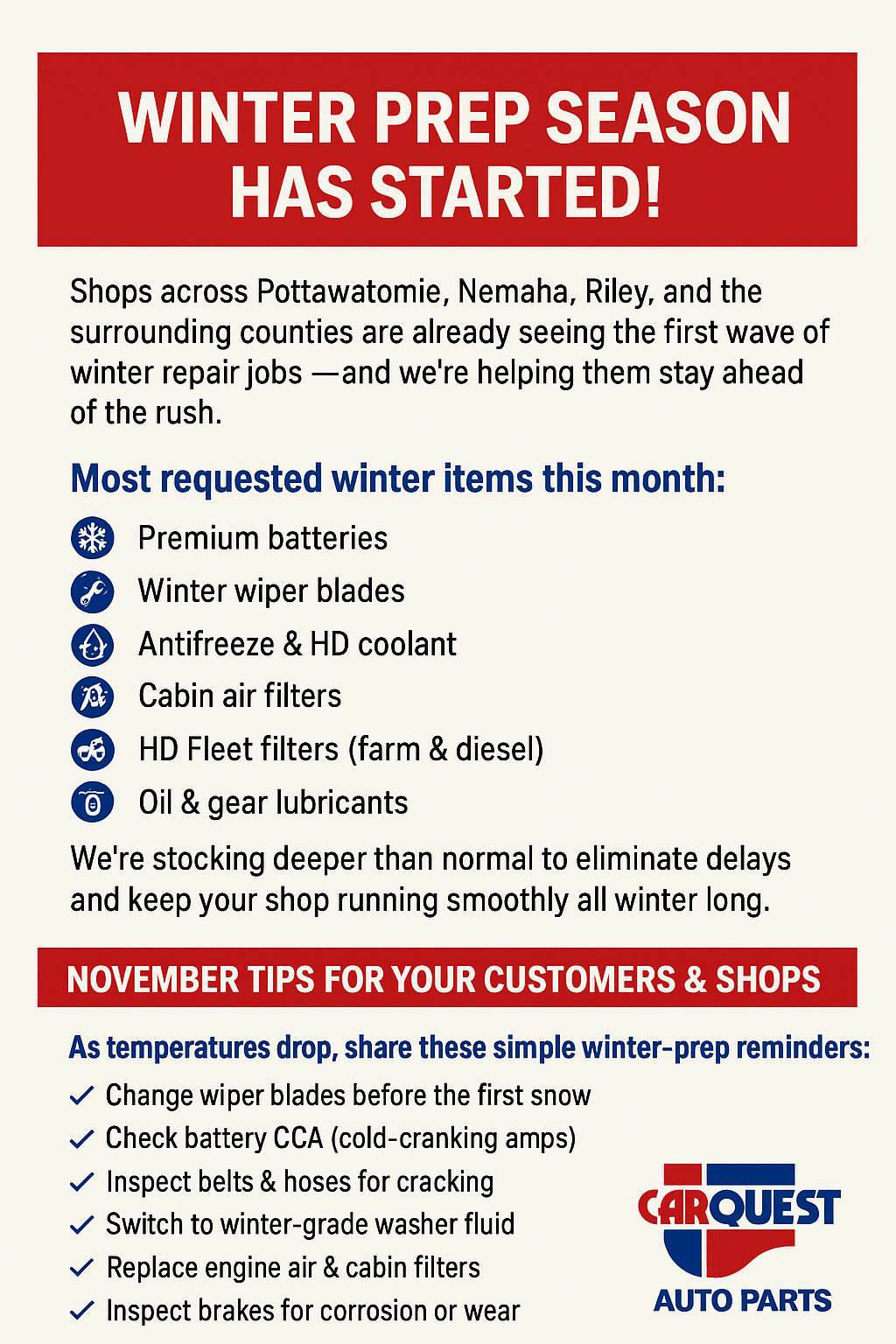 That’s why January is one of the busiest times of the year at Carquest of Seneca, Wamego, and St. Marys. We see the same issues over and over, and most of them can be prevented with a little winter prep.